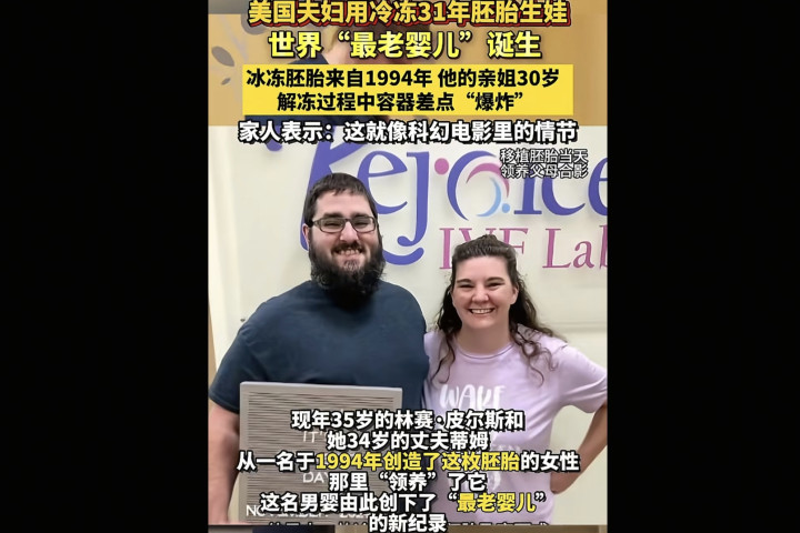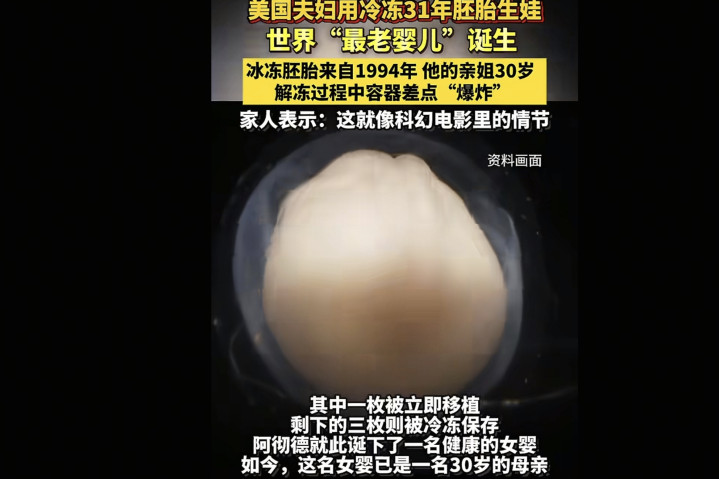 胚胎冰封31年现在已经出生,这枚胚胎是1994年被冰封的,近日终于出生,这样算来这个胚胎也已经31岁啦,实际岁数只有一岁,天呐!这个社会太颠了。